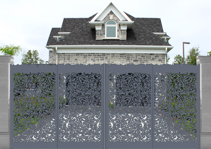 Le portail aluminium arabesque présente un design délicat et raffiné. Ce modèle aux découpes laser de style baroque embellira votre entrée avec douceur et poésie et donnera du cachet à votre maison. Vous pouvez opter pour une découpe partielle ou totale des vantaux de votre portail en fonction du niveau d’intimité et de luminosité que vous souhaitez obtenir.